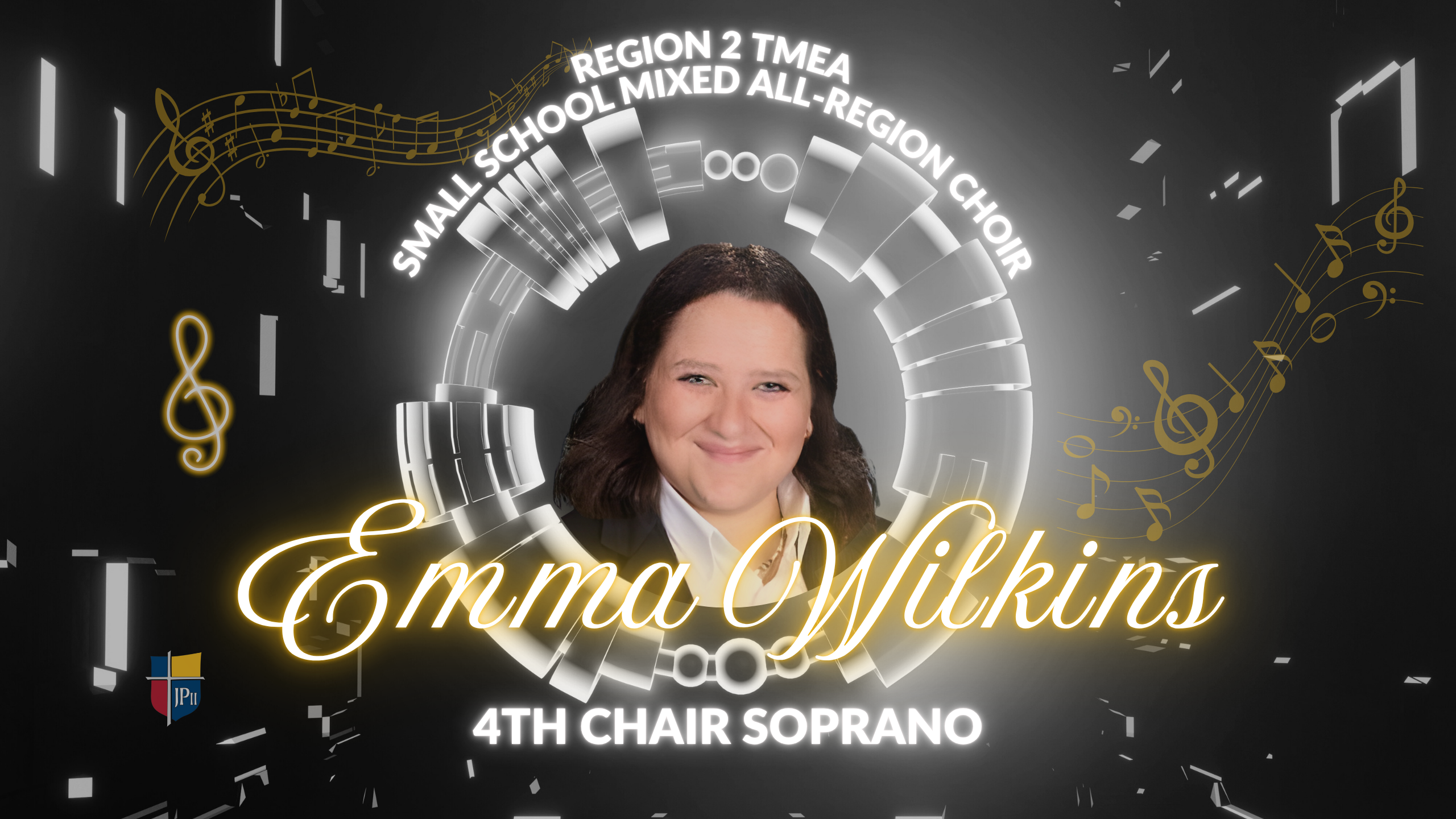 We are proud to announce that junior Emma Wilkins has been selected for the prestigious Region 2 TMEA Small School Mixed All-Region Choir. In a highly competitive Soprano section of 75 students, Emma secured the 4th Chair position through a rigorous audition process that included prepared music cuts and a sight-reading evaluation. This outstanding achievement also qualifies her to advance to the next level of auditions for the TMEA All-State Choir.
